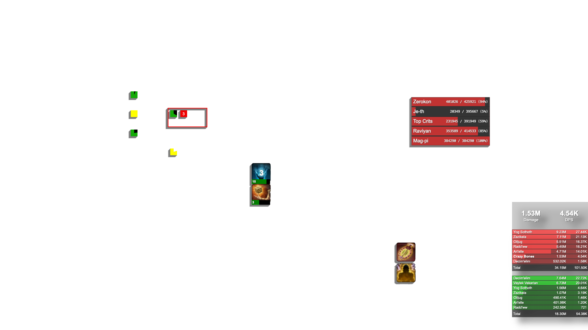 - Total damage and healing for the group.